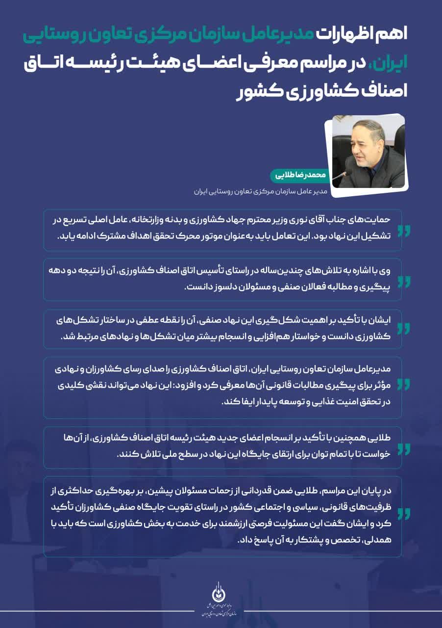 اهم اظهارات مدیرعامل سازمان مرکزی تعاون روستایی ایران در مراسم معرفی اعضای هیئت رئیسه اتاق اصناف کشاورزی‌ کشور