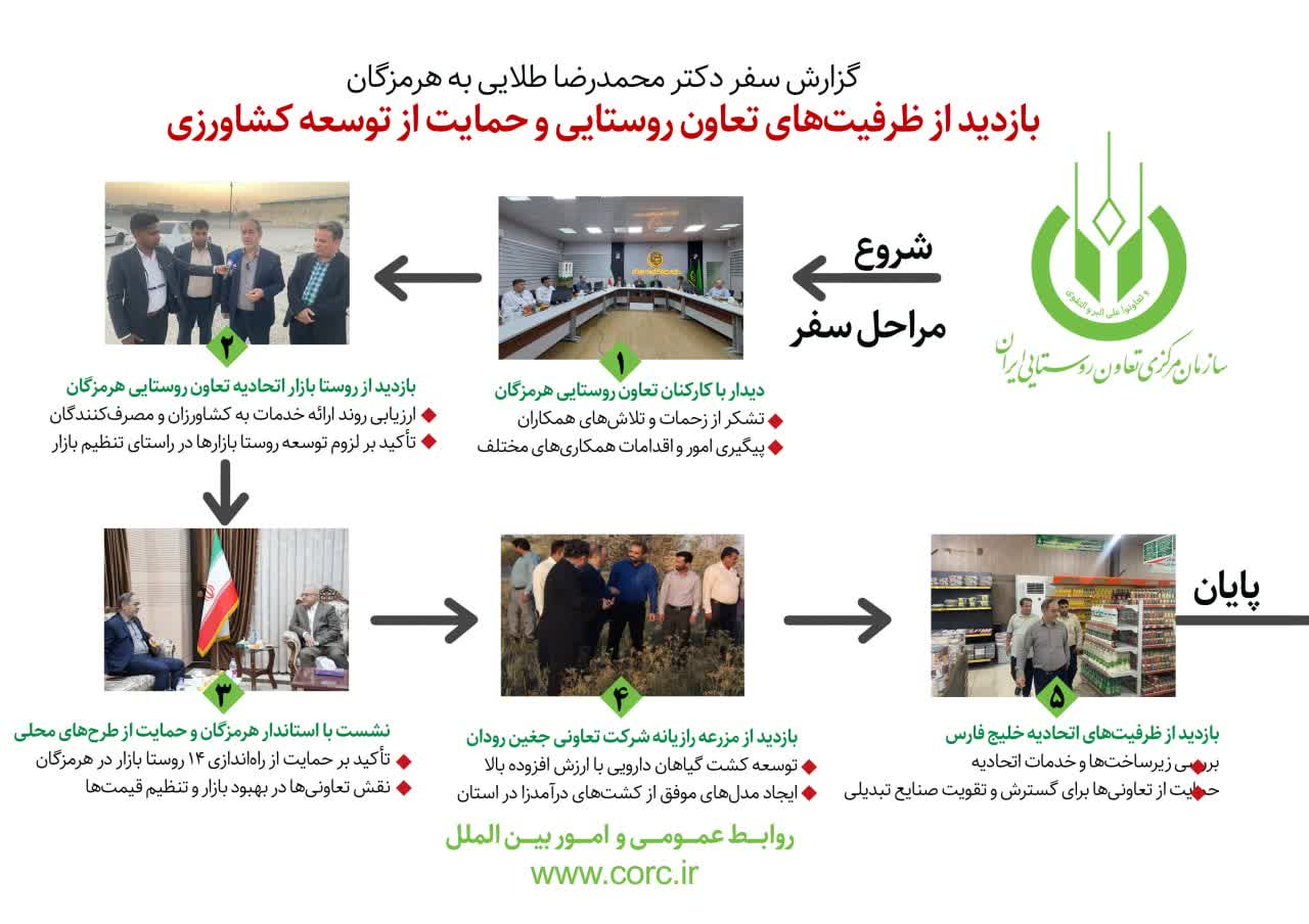 اینفوگراف سفر محمدرضا طلایی مدیرعامل سازمان مرکزی تعاون روستایی ایران به استان هرمزگان و بازدید از ظرفیت‌های تعاون روستایی و حمایت از توسعه کشاورزی